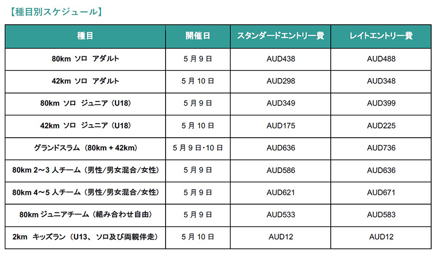 コース:80kmウルトラマラソン(ソロ/2〜5人のリレーチーム)、42kmトレイルマラソン(ソロ)