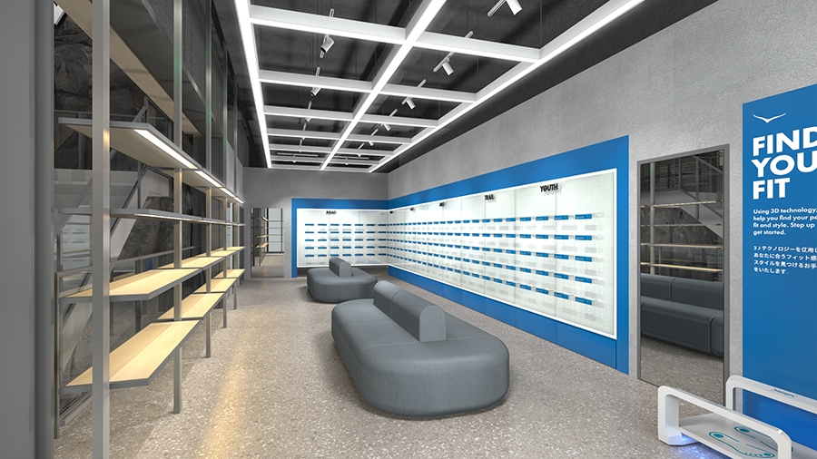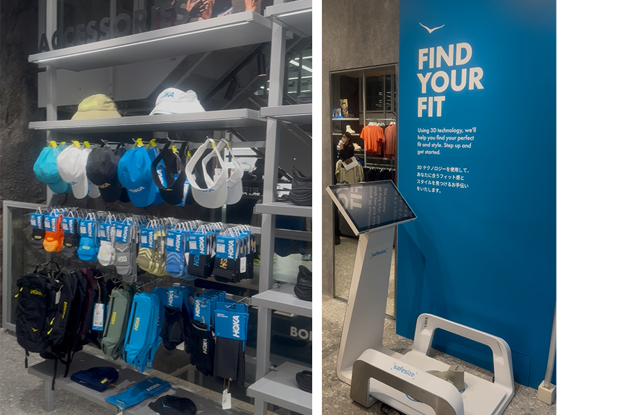 また、各階をつなぐ階段のウォールは、HOKAの発祥の地であるフランス南東部の山々の岩肌を模しており、ブランドのルーツを体感できる。