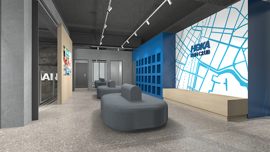 また、フロアのシンボリックなデザイン要素として「HOKA Shibuya」と「HOKA Harajuku」の位置をHOKAのバードマークで示した渋谷・原宿エリアのマップウォールを設置。ベンチやゆったりとしたソファーを配置し、イベント開催時などにランナー同士の交流を深める場に。