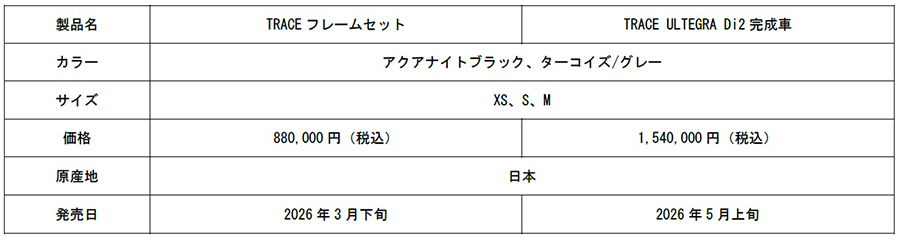 モデル名の「TRACE」は「軌跡」「足跡」を意味し、空気の壁を突破しながら軌跡を描くように思い通りのラインを走り、レースリザルトに足跡を残すという想いが込められている。さまざまな高性能素材を採用し、軽量で扱いやすいフレームを実現した。