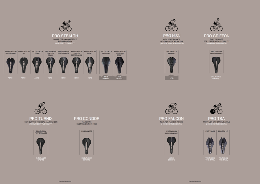 PROサドルの幅広いラインアップは、快適性、ライディングスタイル、身体の柔軟性、ポジション、求めるパフォーマンスや予算など、さまざまな条件から選択することが可能。