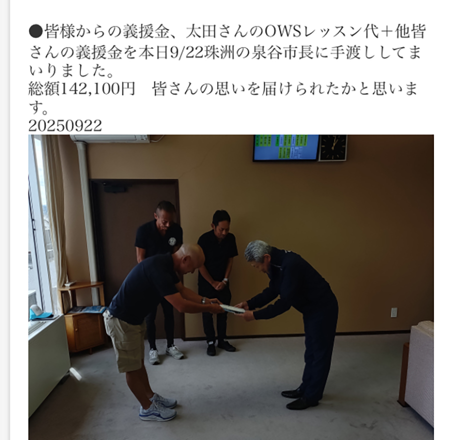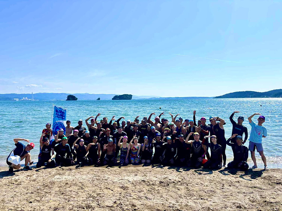 何かできることはないか? のとじまトライアスロンが2025年、震災後復活すると知り、ラプレムメンバー20名超で出場してきました。ラプレムに大会実行委員会の石川在住メンバーがいるので、前日にチャリティーOWSレッスンをできないか相談し、快くOKをもらい実施しました。