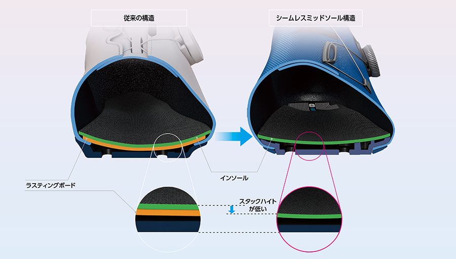 シマノのロードシューズでは定番化している技術なのですが、今回のモデルから「ミッドソール構造」を導入しました。一般的なシューズでは「ラスティングボード」と呼ばれる仮底を入れてからカーボンソールを貼るため、ソールは二重構造になり、スタックハイト(足とペダルの距離)が高くなってしまいます。