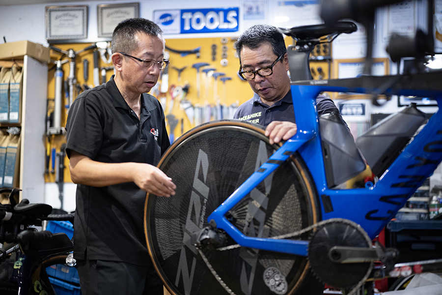 したがって、メンテナンスもほぼ必要としないのも利点だ。今回、鬼ベアリングを実装して試すことになった篠崎友選手もメカニックとして働くバイクショップ「BIKE&HIKE」の竹内正昭代表は、トライアスロンにおけるメリットについて