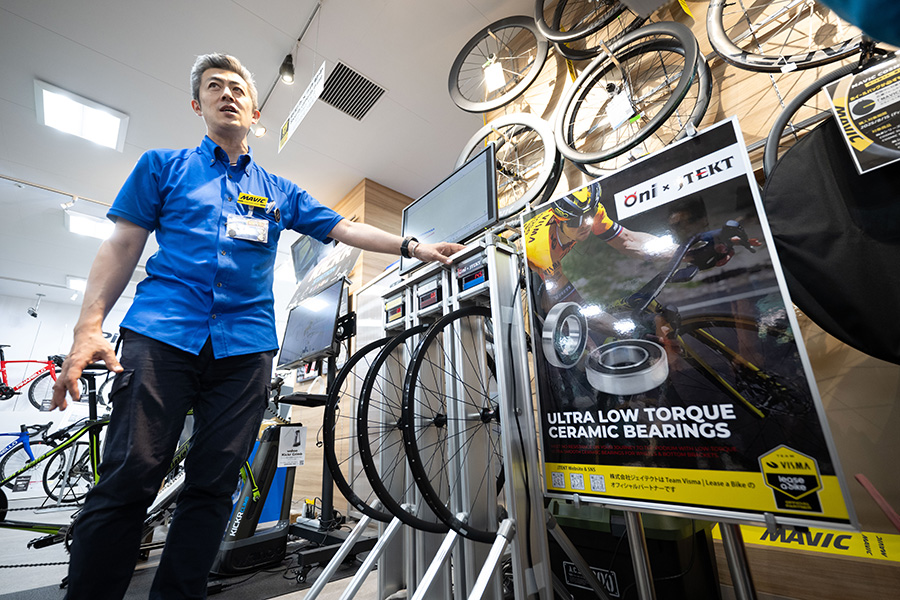 鬼ベアリングを換装したホイールの回りの良さを体感してもらうためのデモ機も置かれたワイズロード新橋店。実際に乘って「違い」が分かる試乗ホイールも準備している
