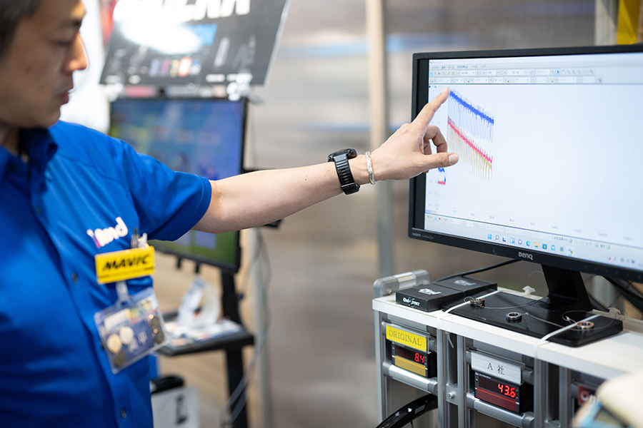 このデモ機では、他社のセラミックベアリングなどと比べても、回転速度が落ちないことが可視化される