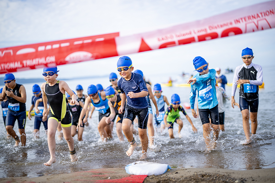 佐渡ジュニアトライアスロンには、Bタイプ優勝の岩渕さんのようにパパママのレースに合わせて参戦する県外の子どもたちも多数