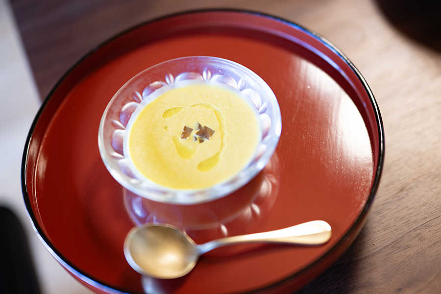 地元食材を使った季節のスープ。この日の冷製スープには海藻を煮溶かして固めた佐渡の郷土料理「いごねり」の食感をアクセントに