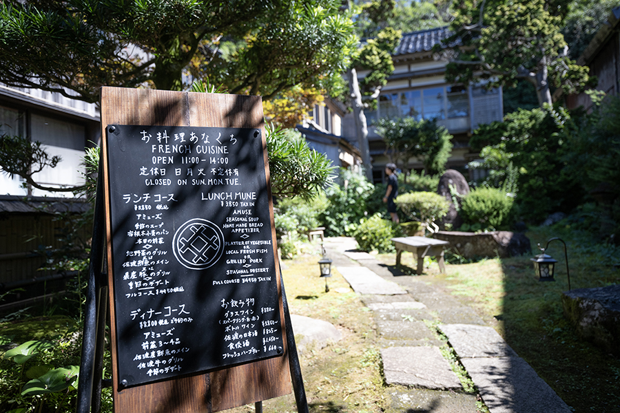 映画のセットのような宿根木の町にある「お料理 あなぐち」。廻船業で栄えた往時をしのばせる雰囲気のある古民家で本格フレンチを