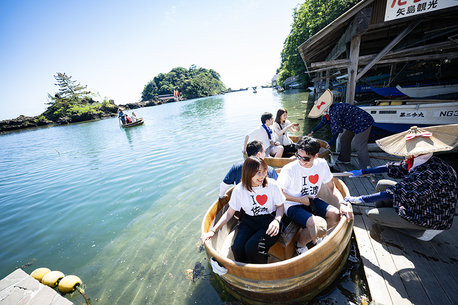 佐渡観光の人気定番メニュー、たらい舟。矢島・経島は小木港から車で約5分、宿根木とも近く、レース前後の観光にもちょうどいい