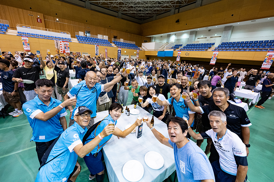 レース前々日の「島祭りパーティー」。佐渡の日本酒やビールで乾杯した後、佐渡の食をしっかり楽しめるとあって選手には大好評!
