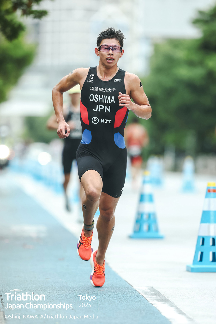 今年もスイムを得意とする吉川、望月満帆、そして大島の3人が先頭でスイムアップ。女子同様、優勝候補の一角である北條がこの集団に入らず、25秒遅れで内田、定塚、福島旺、安松らと一緒に前を追う展開になった。