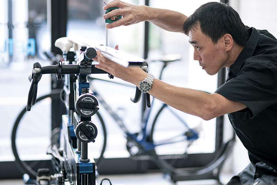 「例えばショップ店員さんは速く走りたいというお客さんにバイクやパーツをお薦めできるけど、走り方は教えられない。コーチはこういうフォームがいいという指導はできても、バイクのポジションはいじれない。でも、ここならその人に合うポジションが作れますし、近くのサイクリングロードで一緒に走って教えることもできる。バイクの買い替えに伴うパーツ選び、フレームサイズもアドバイスできます」