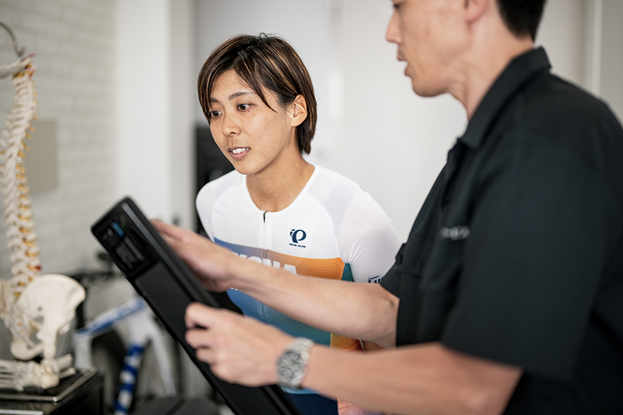 続いて、約項目からなる身体評価を行う。柔軟性や筋肉量なども見極め、バイク練習以外で必要なストレッチや筋トレなども示唆していく。