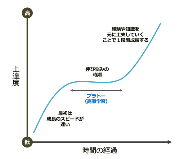 ちなみに……ネガティブにとらえがちなプラトーですが、スポーツ心理学的には「爆発的な成長の前触れ」と解釈をします。学習曲線(図1)を見ていただければ分かるとおり、プラトーの後には急成長の時期がやってきます。