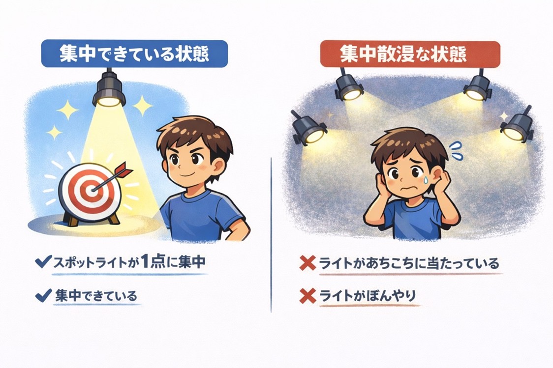 スポットライトに例えるとわかりやすいのですが、集中すべきものにスポットライトがしっかりと照らされている状態が集中できている状態。