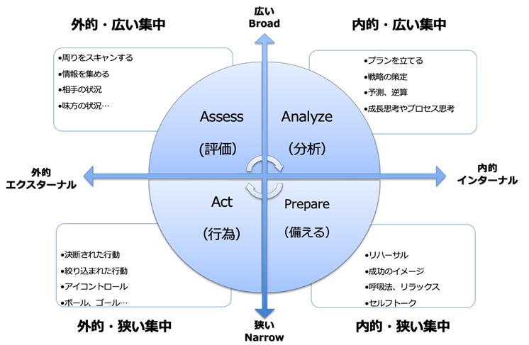 たとえば、泳いでいるときには内的・狭い集中を使って水の感覚に意識を向けた方がパフォーマンスがあがるのか、内的・広い集中でいい泳ぎをイメージしながら泳いだ方がパフォーマンスが上がるのか、など。