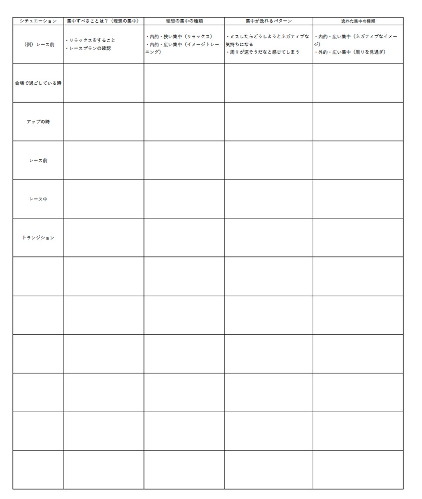 まずは自分がどのシチュエーションでどの集中を使っているのか自己分析をしてみてください。そして練習の時にどこの集中を使いながら泳いだり、走ったりするとパフォーマンスが高まるのかを探っていきます。