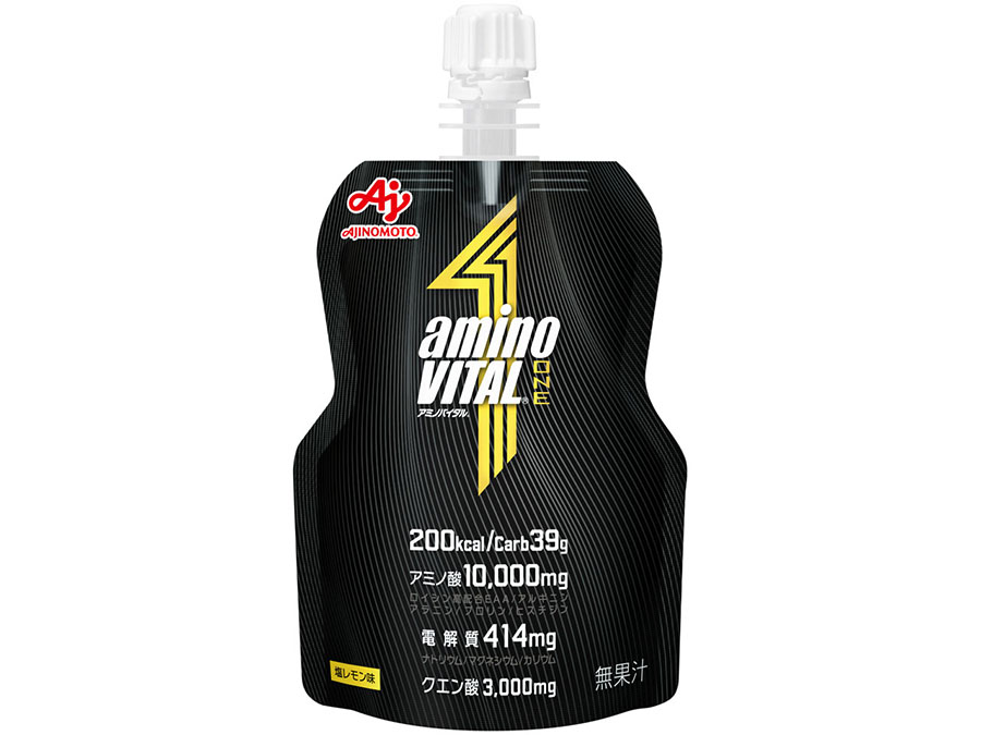 ブランド史上最大量のアミノ酸10,000mgを配合。トライアスリートのファンコミュニティ「アミノバイタル® アスリートクラブ」1400名の声から誕生、試作も100回以上という、エネルギー、電解質、アミノ酸、クエン酸などの栄養素を1本で補給できる限界に挑むアスリートのためのオールインワンゼリー。トレーニングやレースの中盤の摂取がおすすめ。運動中でも摂取しやすいスッキリとした塩レモン味。