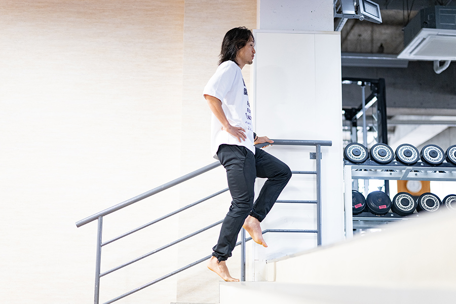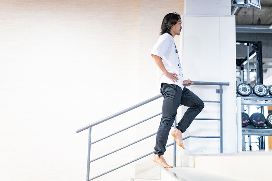 めっちゃ簡単なものですよ。段差とかを見つけて、いわゆるカーフレイズみたいに、カカトを上げた状態からゆっくり5秒かけて下ろす。もうこれだけです。