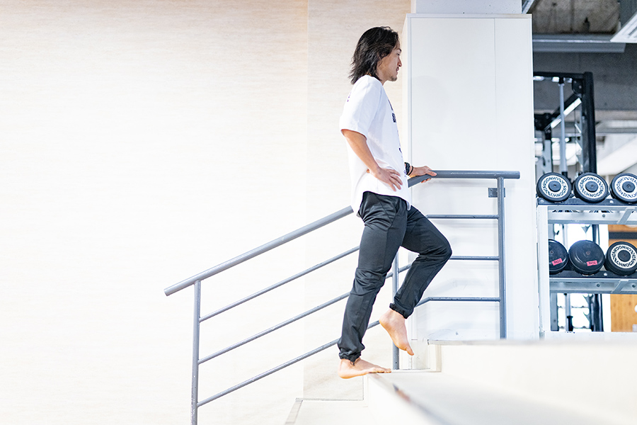 写真のように階段などの段差で片足立ちして、カカトを5秒かけてゆっくり下ろす。まずは支えているほうの足のヒザを伸ばした状態で左右15回ずつ