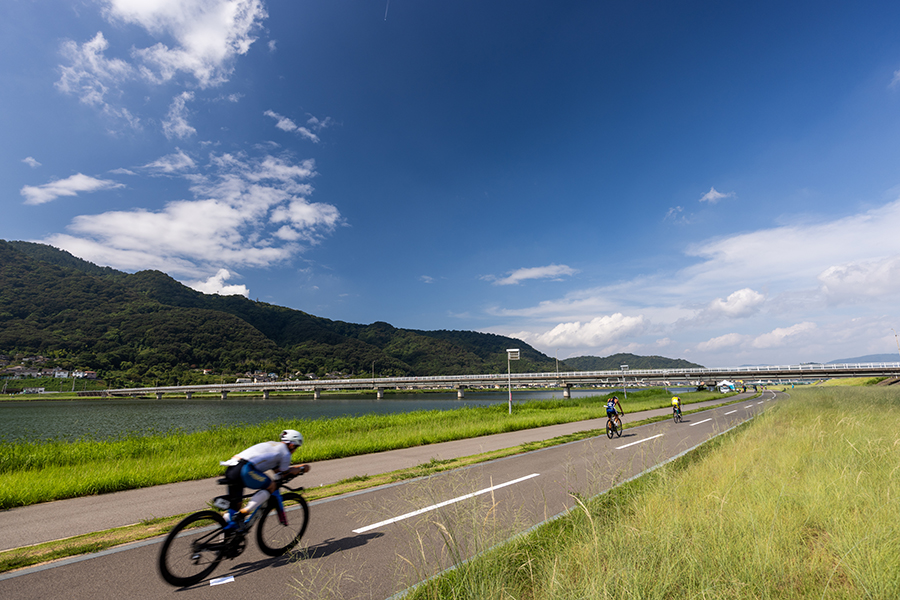 コース紹介芦田川の河川内を泳ぐ。流れや波 もなく、泳ぎやすいコース。バイク:80km